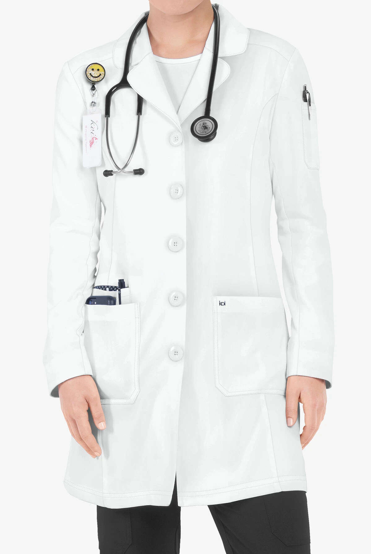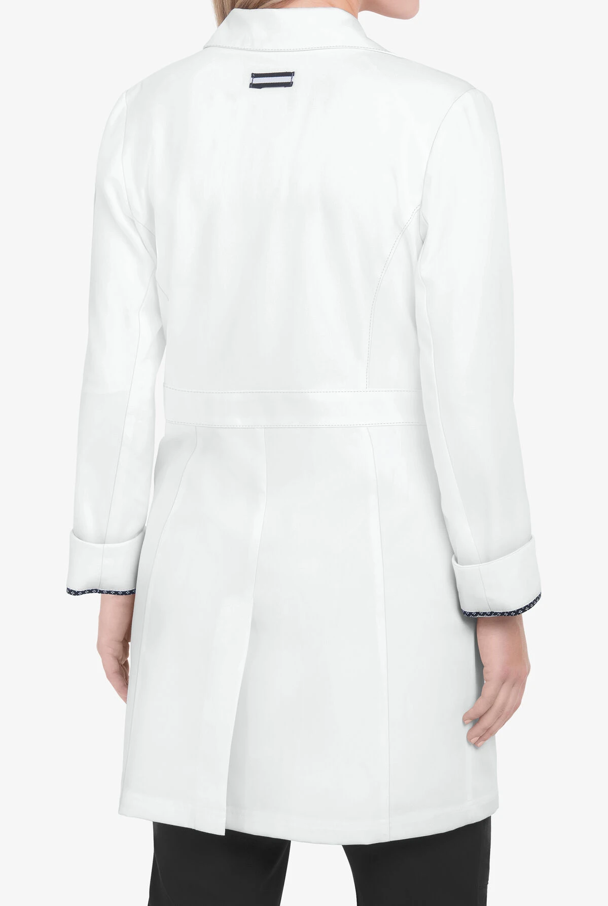 - Black and white bungee ID badge loop on right shoulder